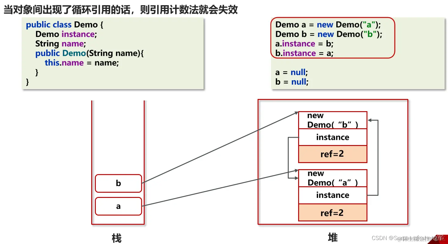 - 可以看到,在方法执行完成后,栈中的引用被释放,但是留下了两个对象在堆内存中循环引用,导致了两个实例最后的引用计数都不为0,最终这两个对象的内存将一直得不到释放,也正是因为这一缺陷,使引用计数算法并没有被实际应用在gc过程中。
