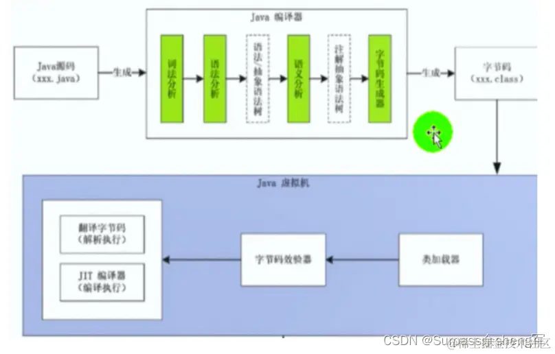 注意: 编译的结果不是生成机器代码,而是生成字节码。字节码不能直接运行,必须由JVM转换成机器码。编译生成的字节码在不同的平台上是相同的,但是JVM翻译的机器码是不同的。