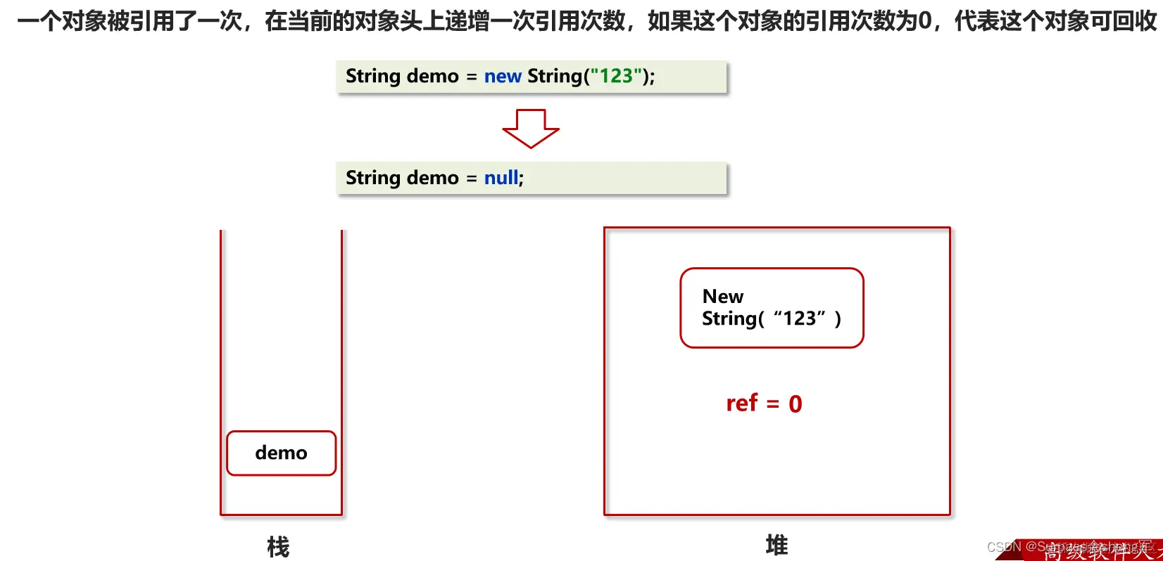 - 在对象中添加一个引用计数器,每当有一个地方引用它时,就在当前对象的对象头上递增依次引用次数,计数器就加 1,当引用失效时计数器减 1。当计数器为0的时候,也就表示这个对象的引用次数为0,表示当前对象可以被回收。