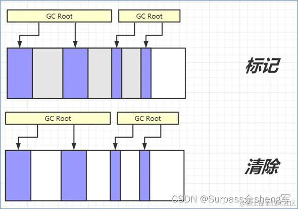 标记清除: 垃圾回收分为2个阶段,分别是标记和清除。遍历整个堆中所有的 GCRoot 对象,如果可以被 GCRoot 就加个标记,沿着 GC Root 对象的引用链找,如果被GC ROOT对象直接或间接引用到的对象也加上标记,剩下所有未被标记的对象都将视为垃圾被清除。直接把所有未被标记的对象全部清除,把它从JVM引用里面给它去掉。这种是最简单的一个方式。