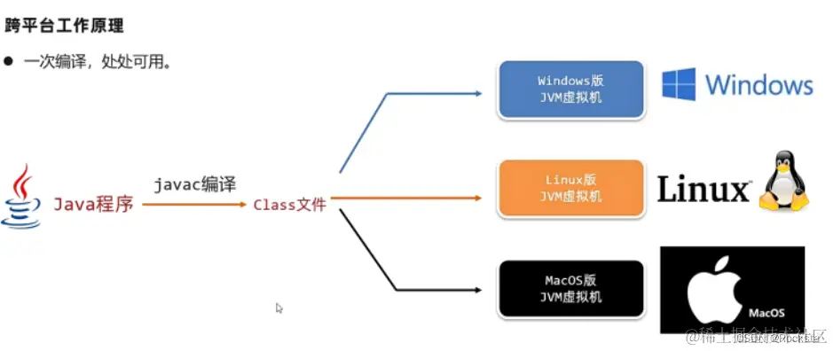 - JVM保证了Java程序跨平台,在需要运行Java应用程序的操作系统上,安装一个与操作系统对应的JVM即可。Java程序可以在任意操作系统上运行。