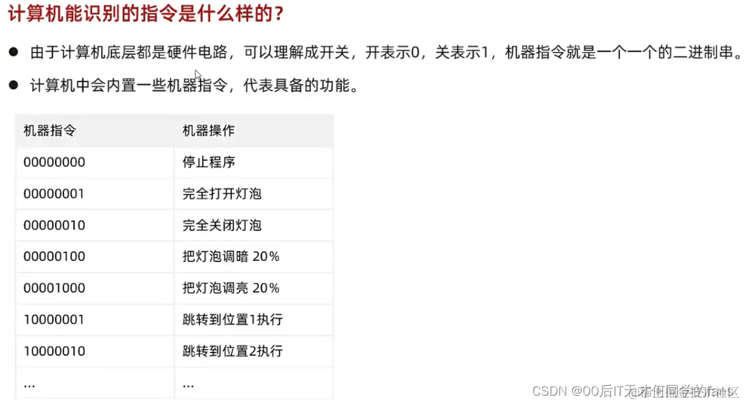 - 编程语言发展历程:机器语言、汇编语言、高级语言。