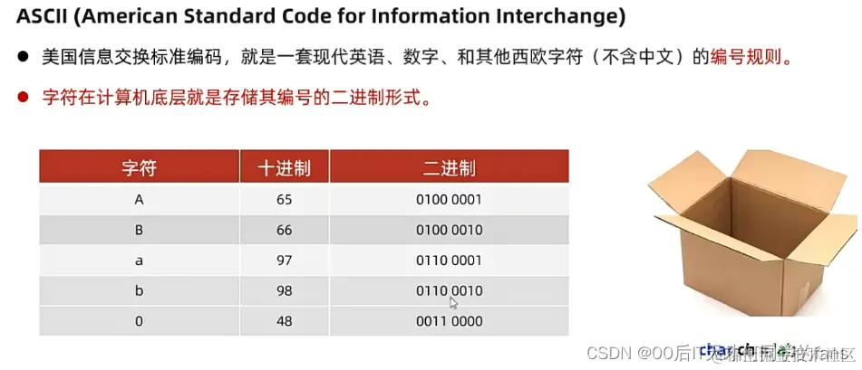 - 为什么要给字符编号:计算机要存字符,但是又不能直接存储字符,只能存储字符编号的二进制形式。