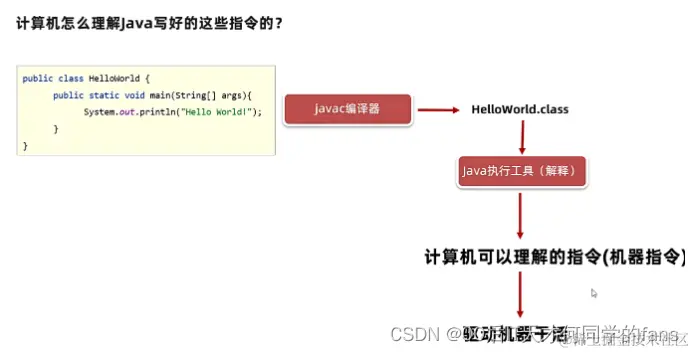 - Java程序是高级语言,计算机底层是硬件不能识别这些语言,必须通过javac编译工具进行翻译,编译成字节码文件(class文件) 然后再通过java执行(解释)工具解释成计算机可以理解的指令(机器指令) 才可以驱动机器干活。