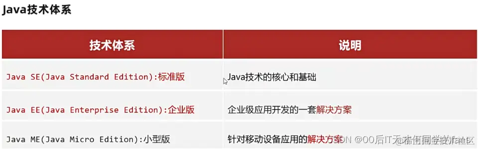 - Java的技术体系 / 平台:JavaSE(标准版)、JavaEE(企业版) 、JavaME(小型版)。
