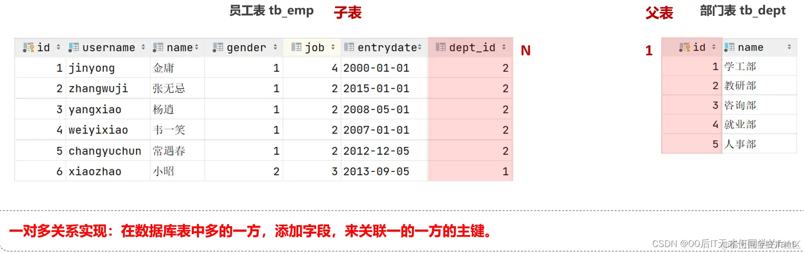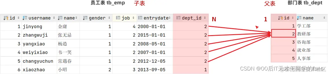 显然,部门和员工就是一种一对多的关系,因为一个部门下是会有多个员工的,但是一个员工只能归属于一个部门,其实这种关系,就是一对多的关系。在这种关系当中,由于一个部门对应多个员工,所以我们把部门叫一的一方,把员工叫多的一方。所以,在一对多的关系当中,我们把一的一方叫做父表,把多的一方叫子表,因为一个父亲可以有多个儿子。因为一个父亲可以有多个儿子,但是一个儿子只能有一个父亲。