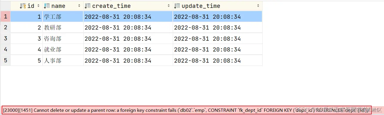 当我们添加了外键之后,再删除ID为1的部门,就会发现,此时数据库报错了,不允许删除。