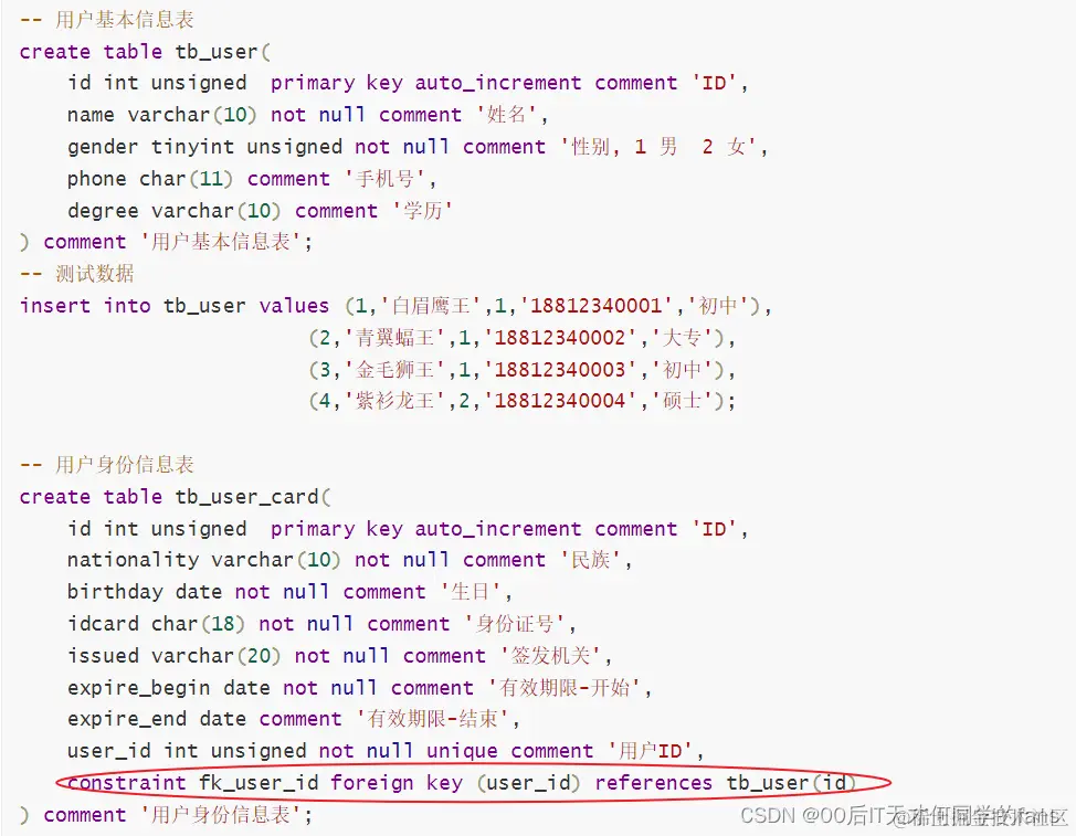 一对一关系比较典型的就是用户与身份证的关系,一个用户对应一张身份证,而一张身份证也只能归属于 / 关联一个用户。