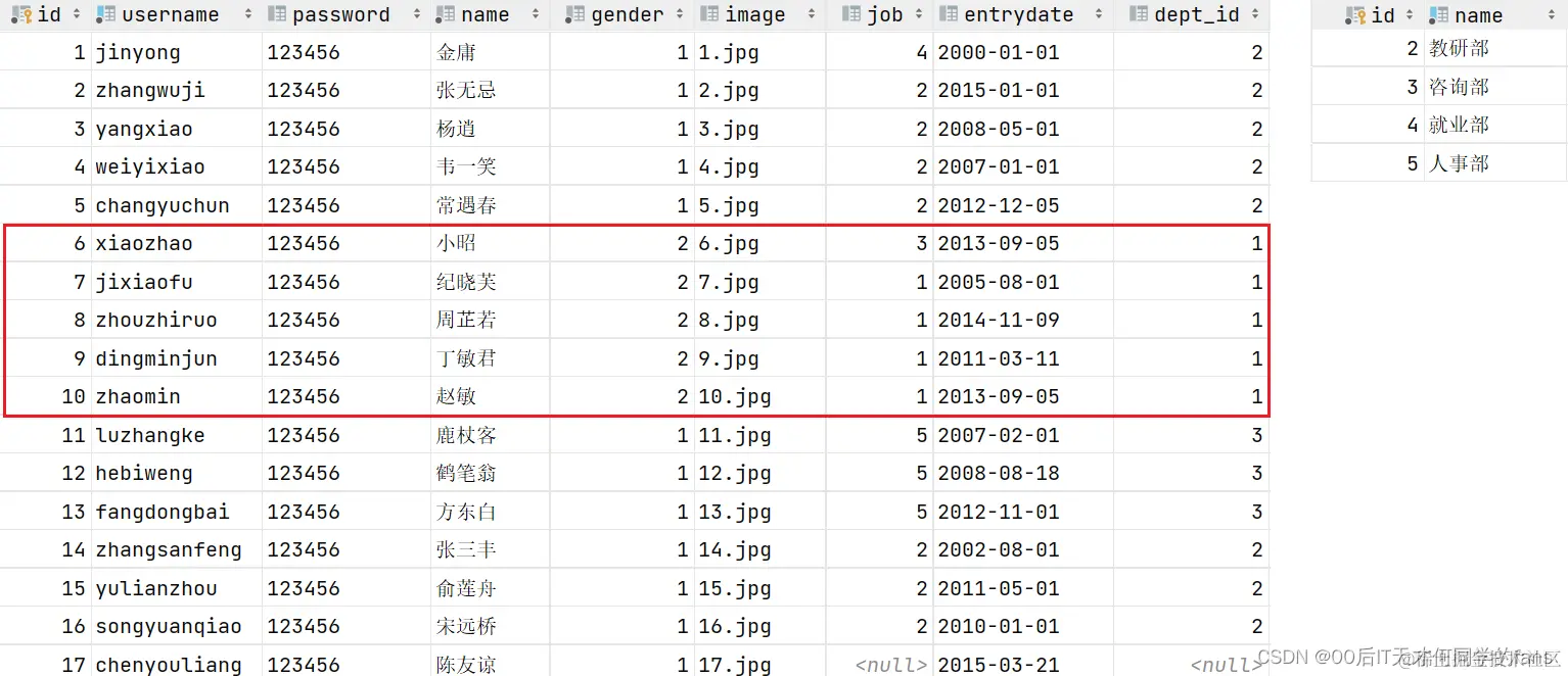 现在员工表中有五个员工都归属于1号部门(学工部),当删除了1号部门后,数据变为:
