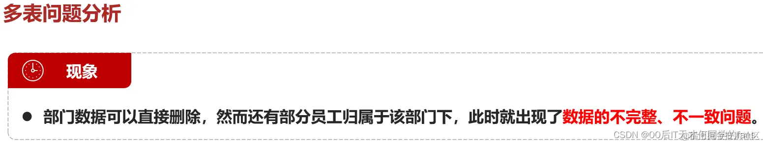 1号部门被删除了,但是依然还有5个员工是属于1号部门的。 此时:就出现数据的不完整、不一致了。