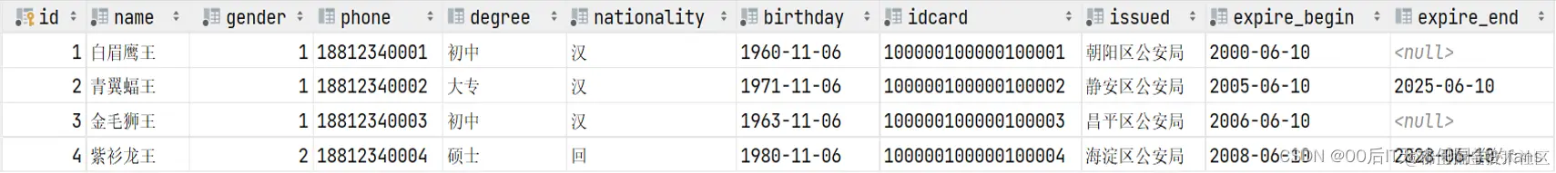 - 身份信息:民族、生日、身份证号、身份证签发机关,身份证的有效期(开始时间、结束时间)