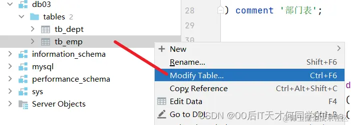 部门表创建好之后,我们还需要再修改下员工表。为什么要修改员工表呢?是因为我们之前设计员工表(单表)的时候,并没有考虑员工的归属部门。