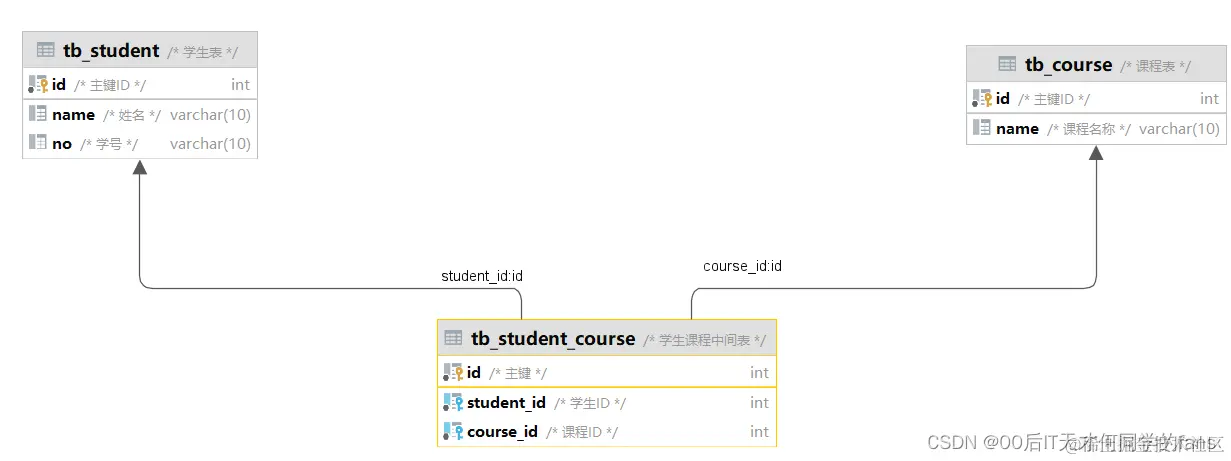 - 中间表当中的这些数据就维护了学生与课程之间的关系