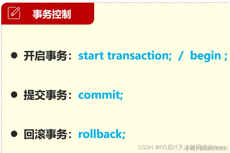 - 回滚: 出现问题,数据恢复到开启事务时的状态- 结束事务(提交|回滚)