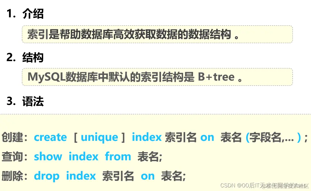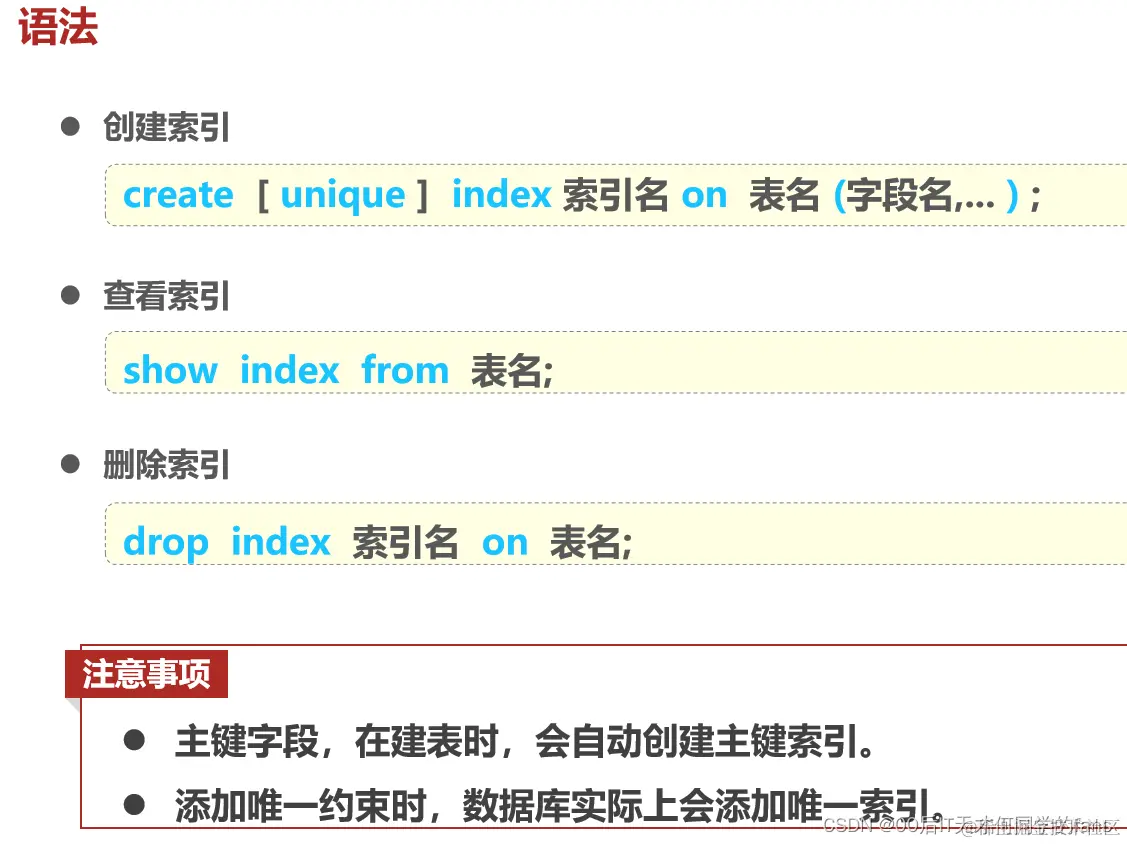 索引的操作语法,主要包括三个部分:创建索引、查看索引和删除索引。