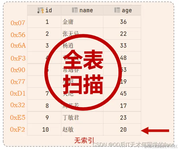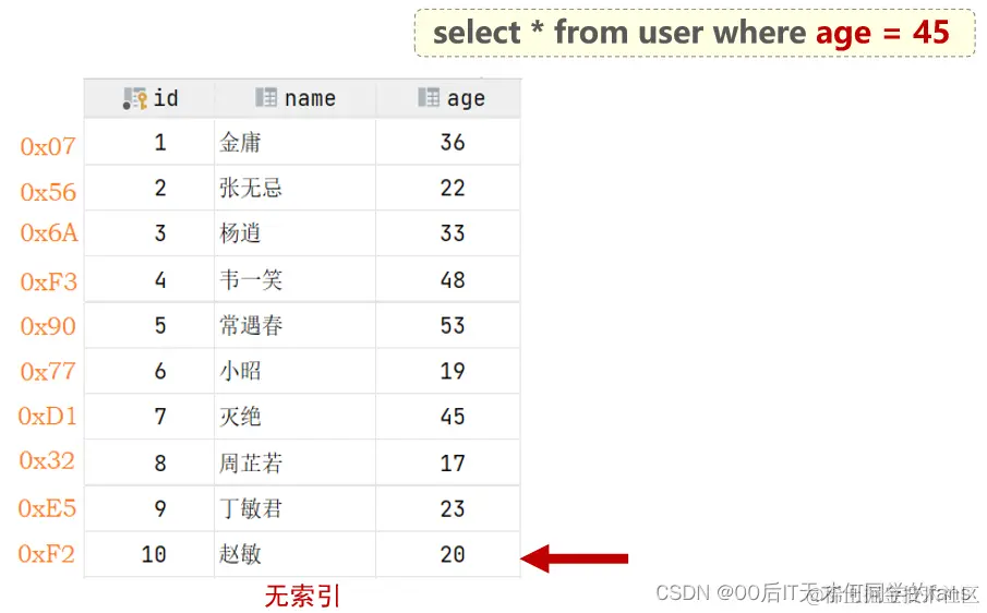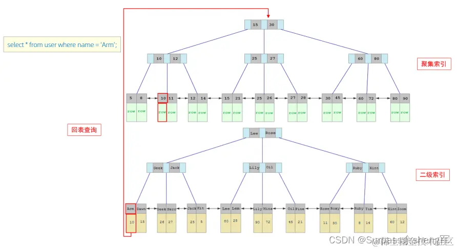 - 由于是根据name字段进行查询,所以先根据字段值name='Arm'到name字段的二级索引中进行匹配查找,因为二级索引就是根据字段建立的索引,但是在二级索引中只能查找到字段 Arm 对应的主键值 10。
