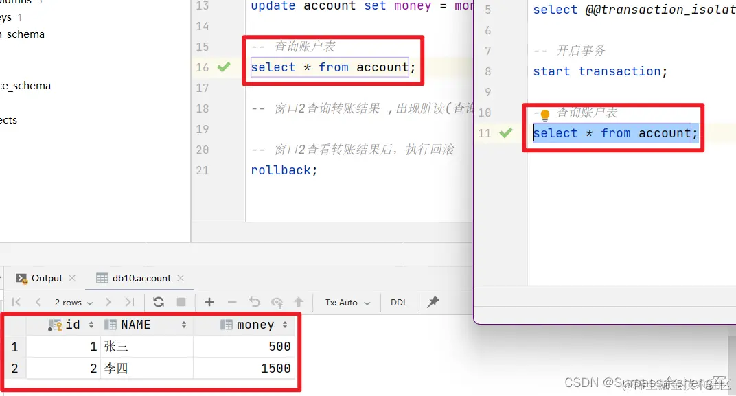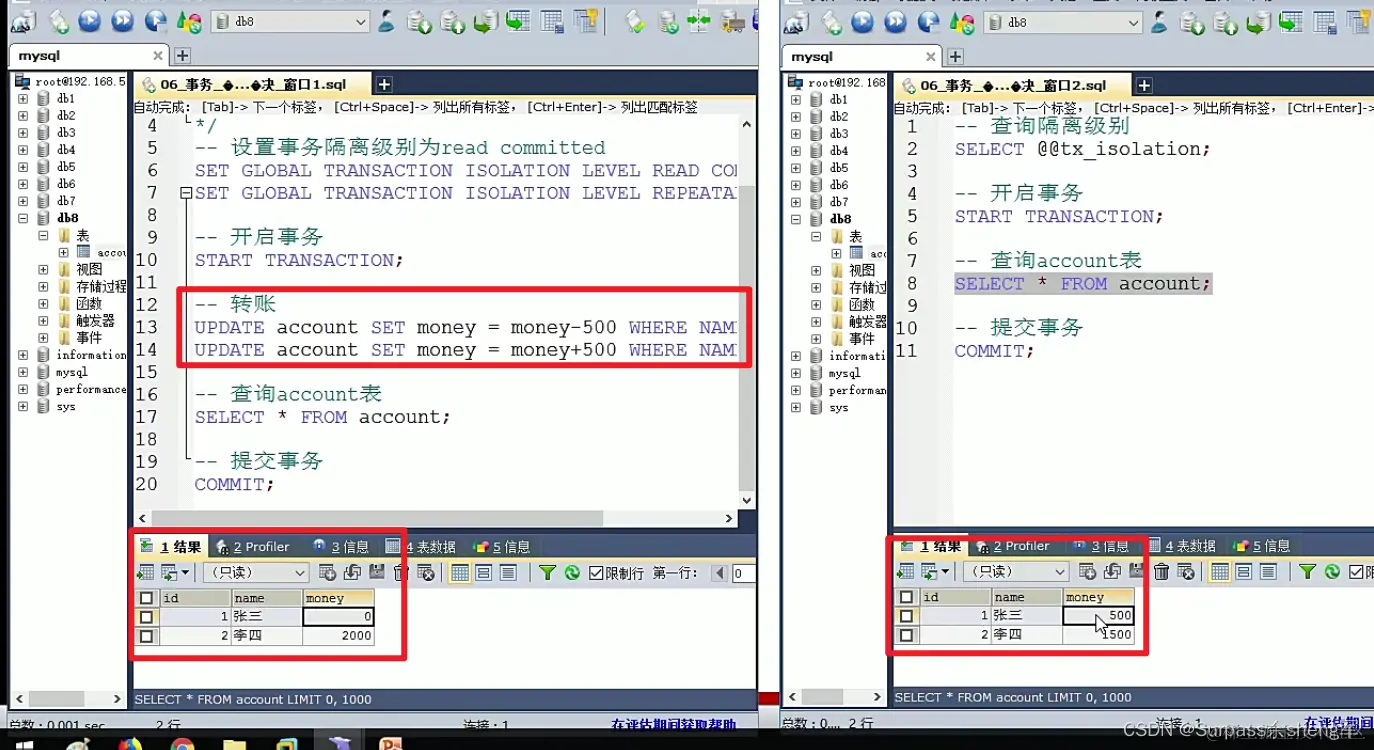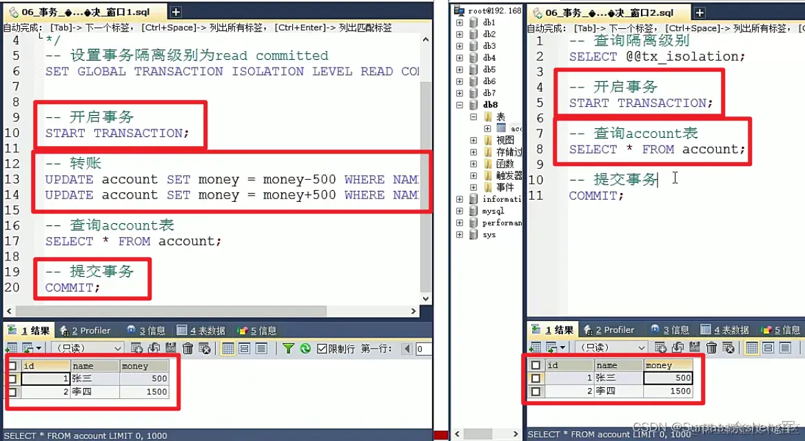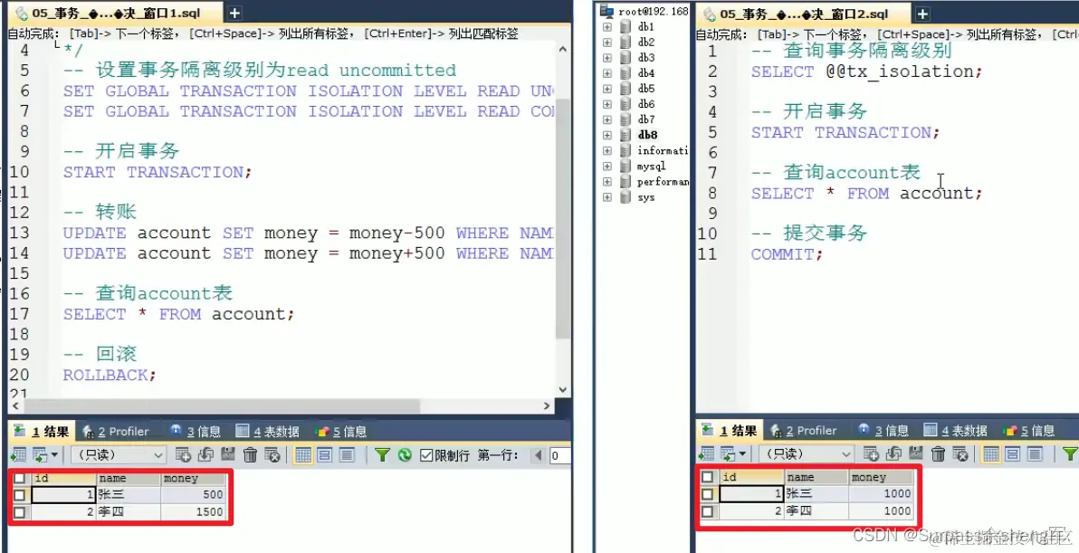 -- =======================管理事务演示========================= -- 开启事务 START TRANSACTION; -- 张三给李四转账500元 -- 1.张三账户-500 UPDATE account SET money=money-500 WHERE NAME='张三'; -- 2.李四账户+500 -- 出错了... UPDATE account SET money=money+500 WHERE NAME='李四'; -- 回滚事务(出现问题) ROLLBACK; -- 提交事务(没出现问题) COMMIT;