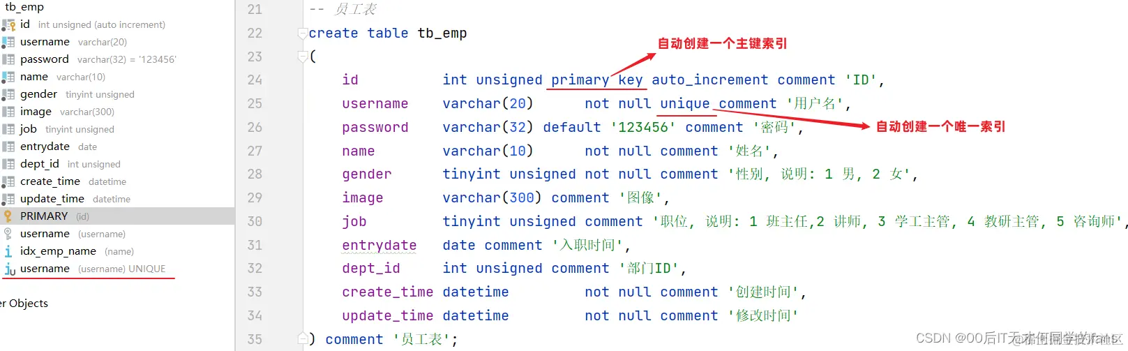 -- 在创建表时,如果添加了主键和给某一个字段添加了唯一约束,数据库就会默认创建:主键索引、唯一索引(UNIQUE INDEX)