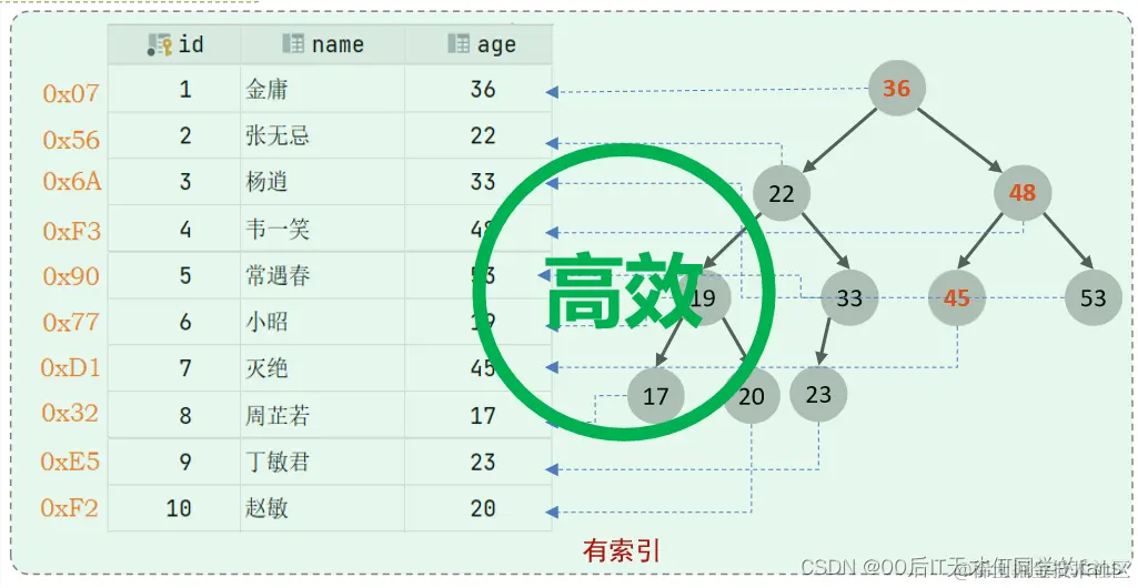 - 因为A语句直接走聚集索引,直接返回数据。 而B语句需要先查询name字段的二级索引,然 后再查询聚集索引,也就是需要进行回表查询。