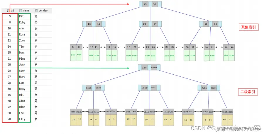 聚集索引和二级索引 / 辅助索引 / 非聚簇索引 的具体结构如下: