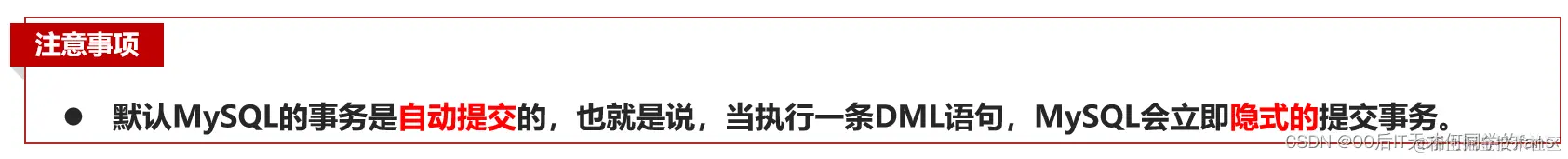- 原因是在MySQL数据库当中,事务默认是自动提交的,也就是说,当我们在执行一条DML 语句的时候,一旦这条DML语句执行完成,MySQL当中的事务会立刻提交。