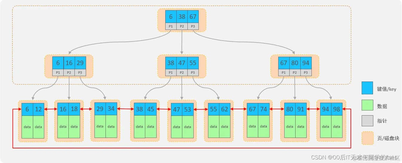 - 从范围查询效率方面来说:B+树将所有存储在叶子节点当中的数据使用了双向有序链表的方式来进行关联,以此提高范围查询和顺序遍历的效率,便于数据的排序操作{order by}。B树的叶子节点都是独立的