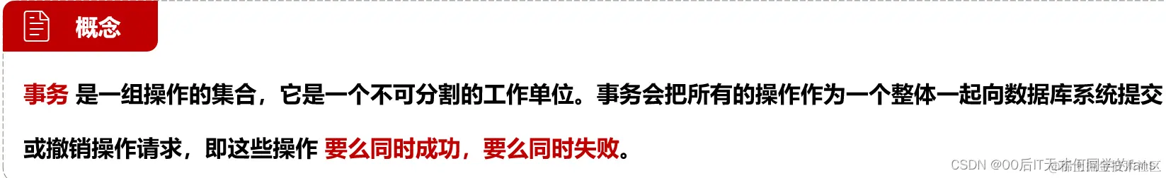- 事务是一组操作的集合,它是一个不可分割的工作单位,事务会把所有的操作作为一个整体一起向系统提交或撤销操作请求,即这些操作要么同时成功,要么同时失败。