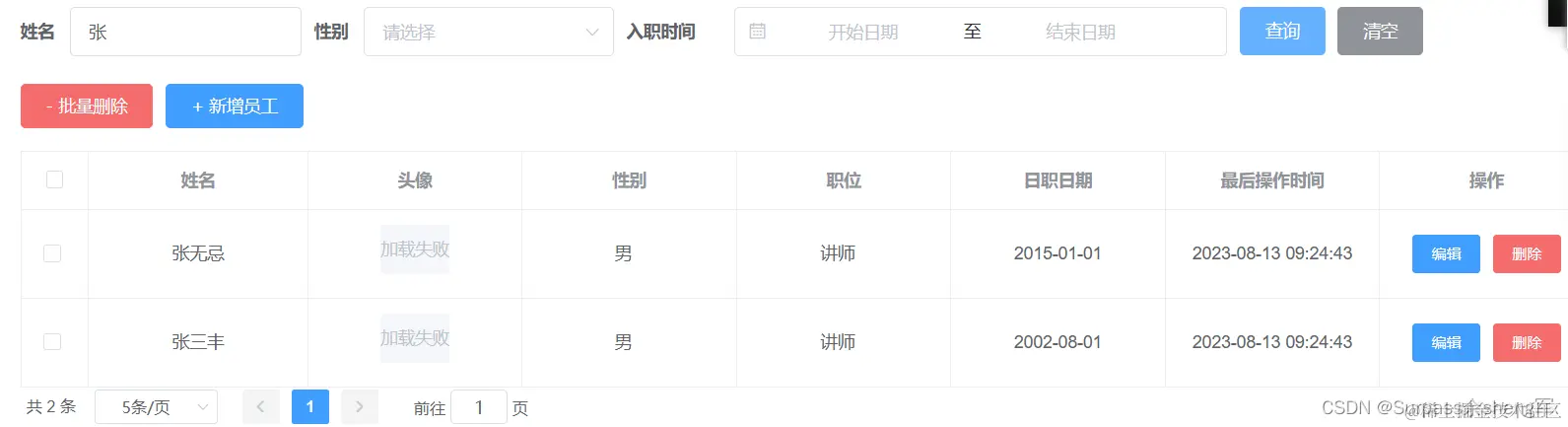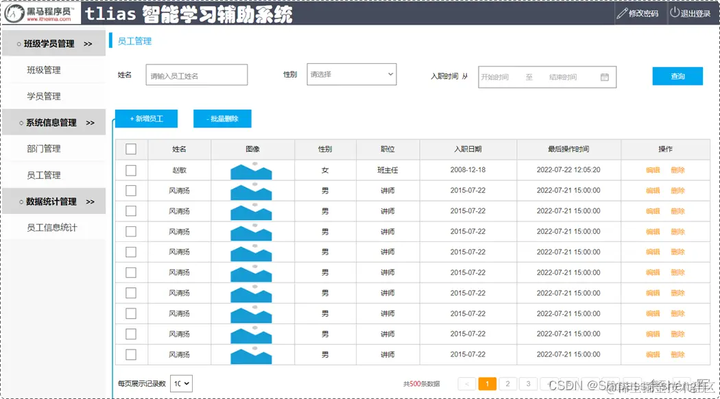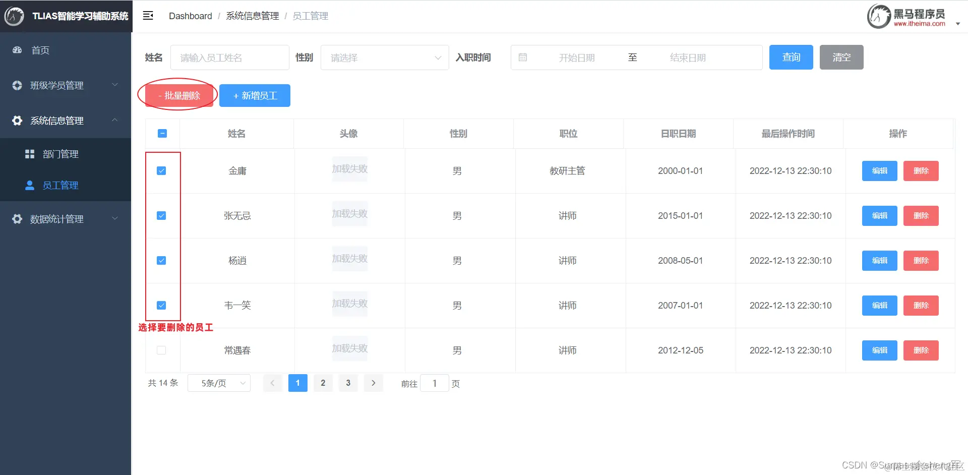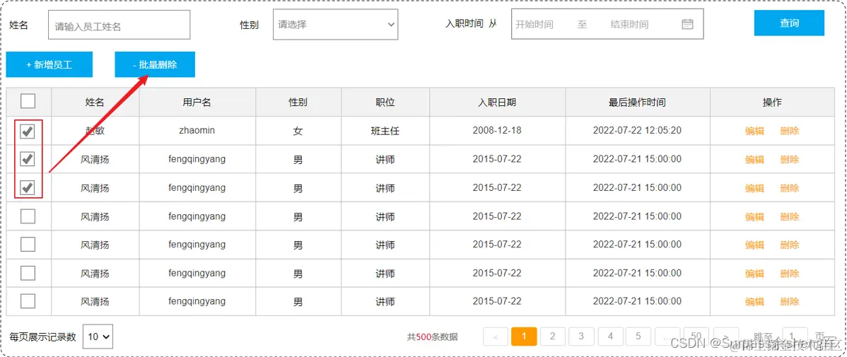 当我们勾选列表前面的复选框,然后点击 "批量删除" 按钮,就可以将这一批次的员工信息删除掉了;也可以只勾选一个复选框,仅删除一个员工信息。