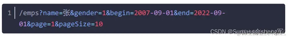 请求参数:跟随在请求路径后的参数字符串。 例:/emps?page=1&pageSize=10