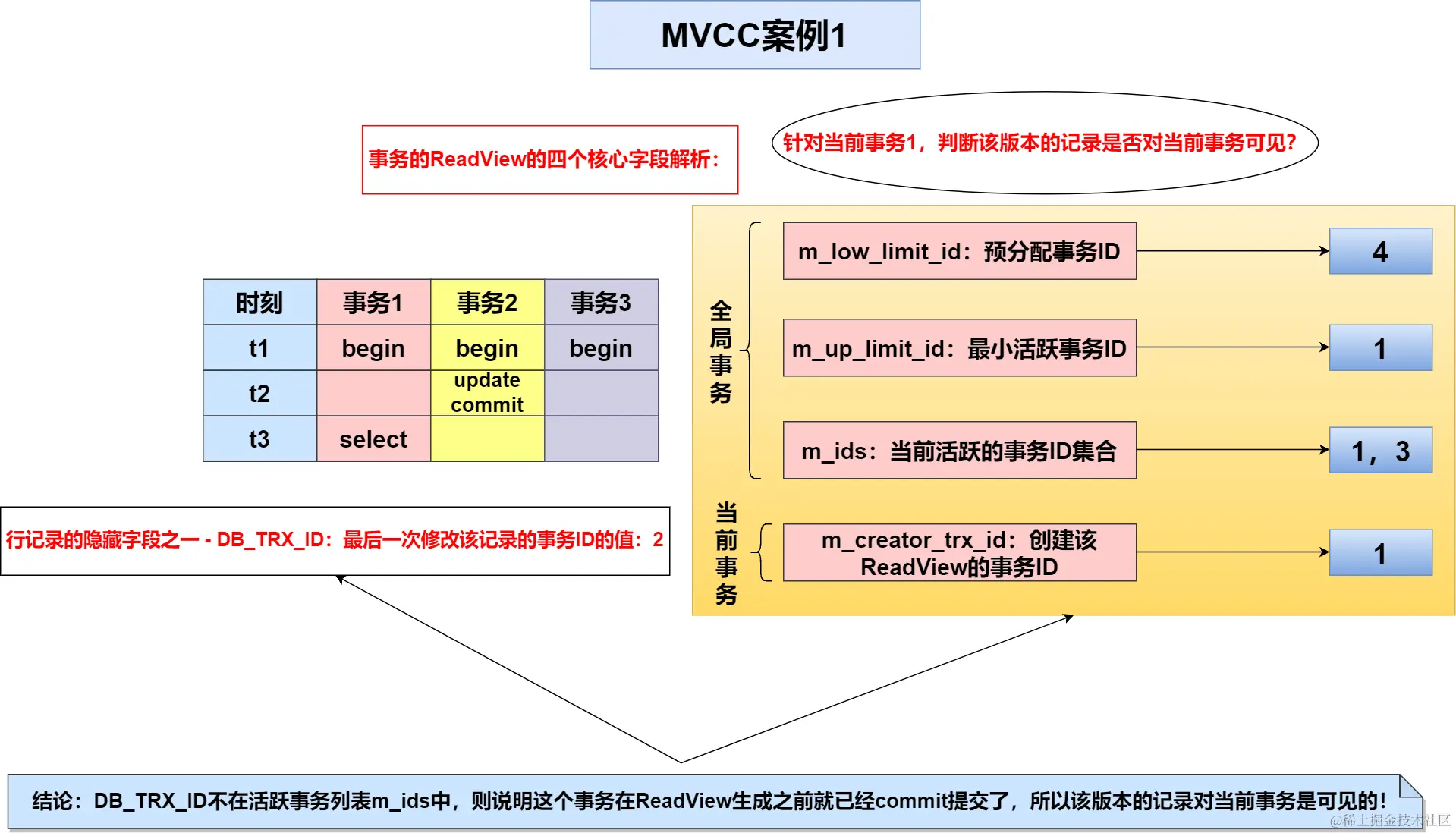 - 结论:DB_TRX_ID在活跃事务列表m_ids中,则代表在ReadView生成时刻,这个事务还是活跃状态,还没有commit提交,所以该版本的记录对当前事务不可见!