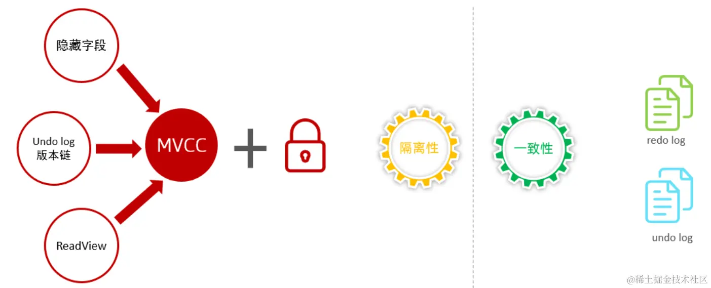 - 这两个隔离级别实现是通过「事务的 Read View 里的字段」和「记录中的两个隐藏列」的比对,来控制并发事务访问同一个记录时的行为,这就叫 MVCC(多版本并发控制)。