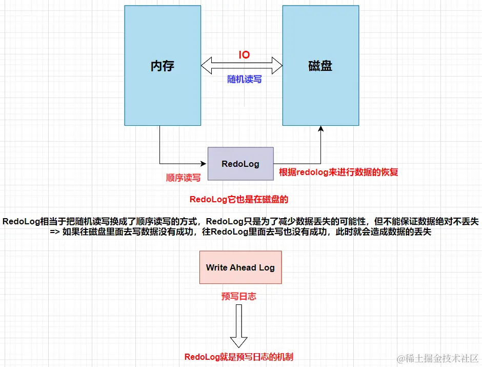 - RedoLog重做日志是去保证持久性的,即持久性通过RedoLog重做日志实现,因为如果你在内存里面更改了以后没有同步到磁盘,假如发生宕机,就会导致数据丢失,如果发生数据丢失,一致性就保证不了了。