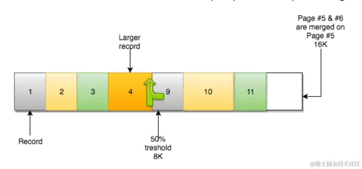 如果页中的数据被删除,那么实际上这块的空间并不会被回收,而是标记为可重复利用.当一个页的数据被删除或者更新,空间小于所规定的阈值大小,那么Mysql会查找前一个页,和后一个页,判断是否可以将这个页合并到另外一个页,这样就可以节省下一个页的空间.以下是Page5和Page6的一个合并过程:
