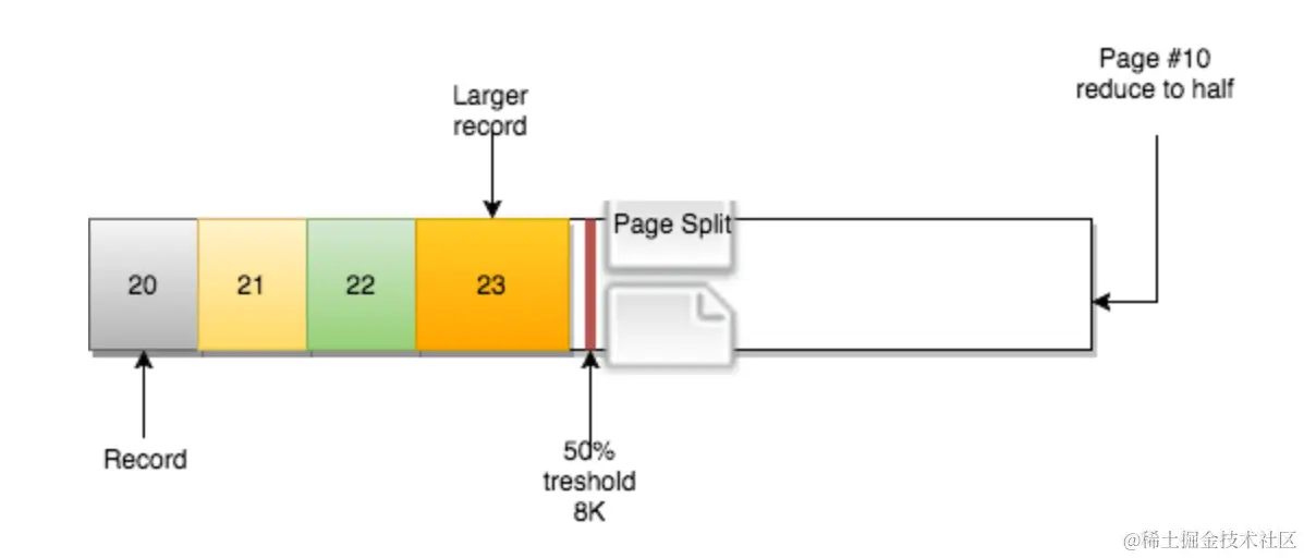 如果一个页快满了,此时我们插入数据,但下一个页的空间也全部占满.这个时候Mysql将创建一个新页,然后将快满的这个页的部分数据迁移到新页中,这部分数据就是超出原来那个页阈值的那部分数据,之后再插入新的数据.以下是一个页分裂过程: