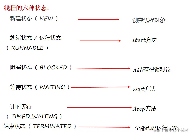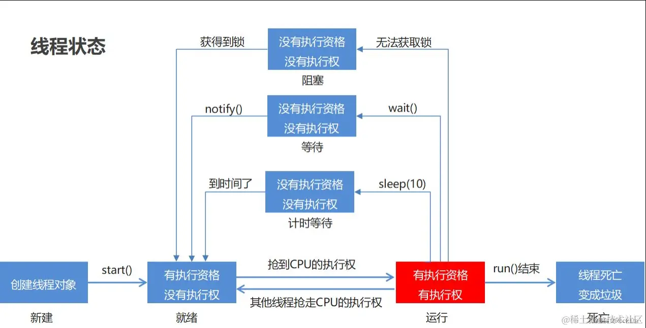 - 线程是在调用start方法之后,它才变成就绪状态,在就绪状态下,线程开始去抢夺CPU的执行权,它是正在抢,但是还没有抢到,没有抢到就无法执行代码。所以就绪状态它是有执行资格,但是没有执行权。