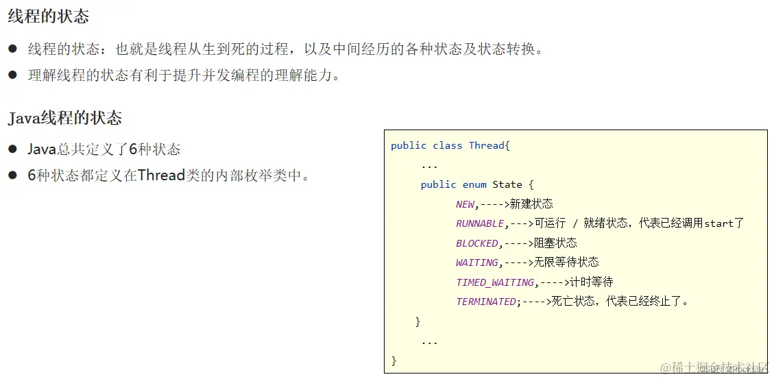 - 状态被定义在了java.lang.Thread.State枚举类中,State枚举类的源码如下: