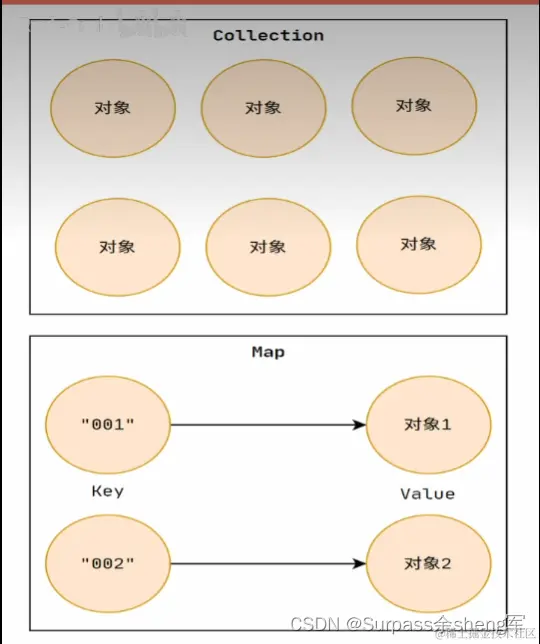 - Collection主要用于存放单一类型的元素,Map则用来存放映射关系,存放键值对元素。