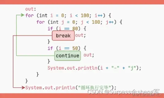 - Java为了防止goto滥用,虽然保留了goto关键字,但这个关键字没有任何作用,然后Java发明了一种带标签的continue和break语句,用来跳出多重循环,实际上它就是一种带限制的,专门用于循环的goto语句
