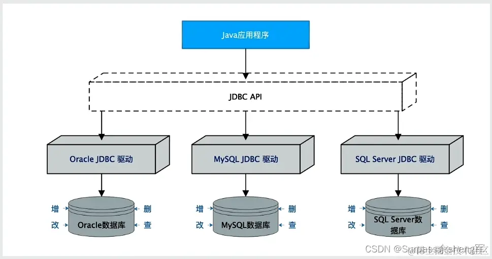 最上层是Java应用程序,会调用JDBC的API,然后再映射到对应的数据库驱动,最后通过驱动去访问数据库。