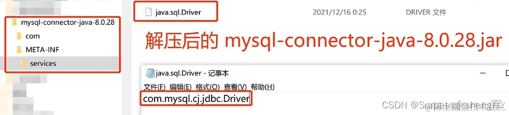 我们以MySQL为例,将mysql-connect-java的Jar包解压后,可以看到目录META_INF/services下存在一个名为java.sql.Driver的配置文件,而文件内容则是MySQL的数据库驱动类。