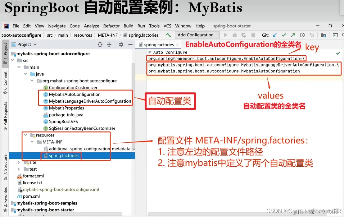 - 提供了自动配置功能的Jar包,通常被称为starter,例如:mybatis-spring-boot-starter等等