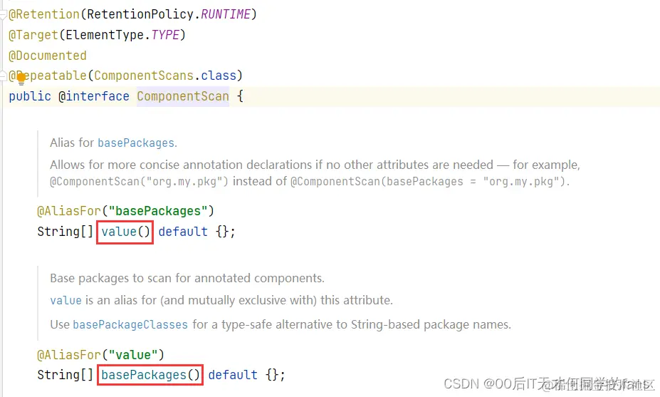 - 通过属性来指定要扫描哪个包,可以通过两个属性,一个是value属性,一个是basePackage