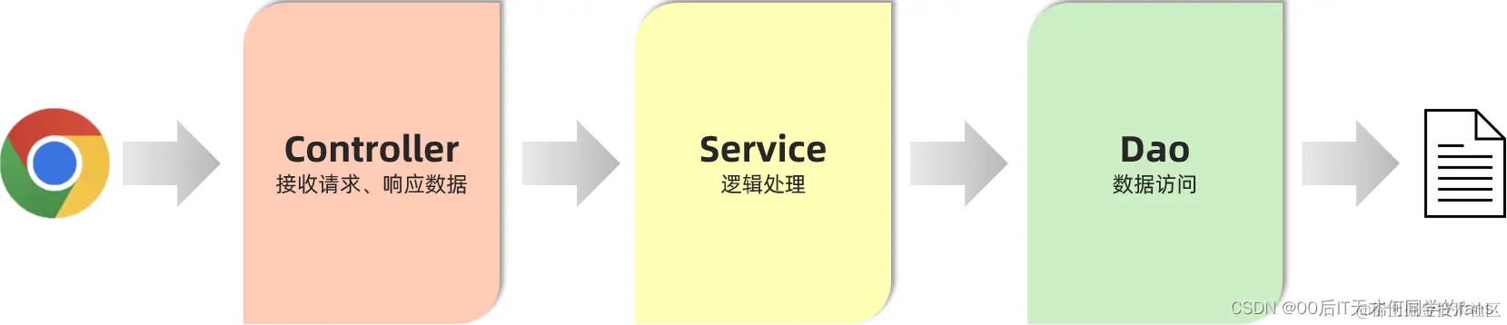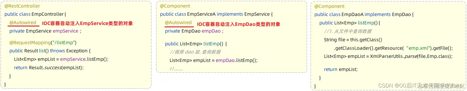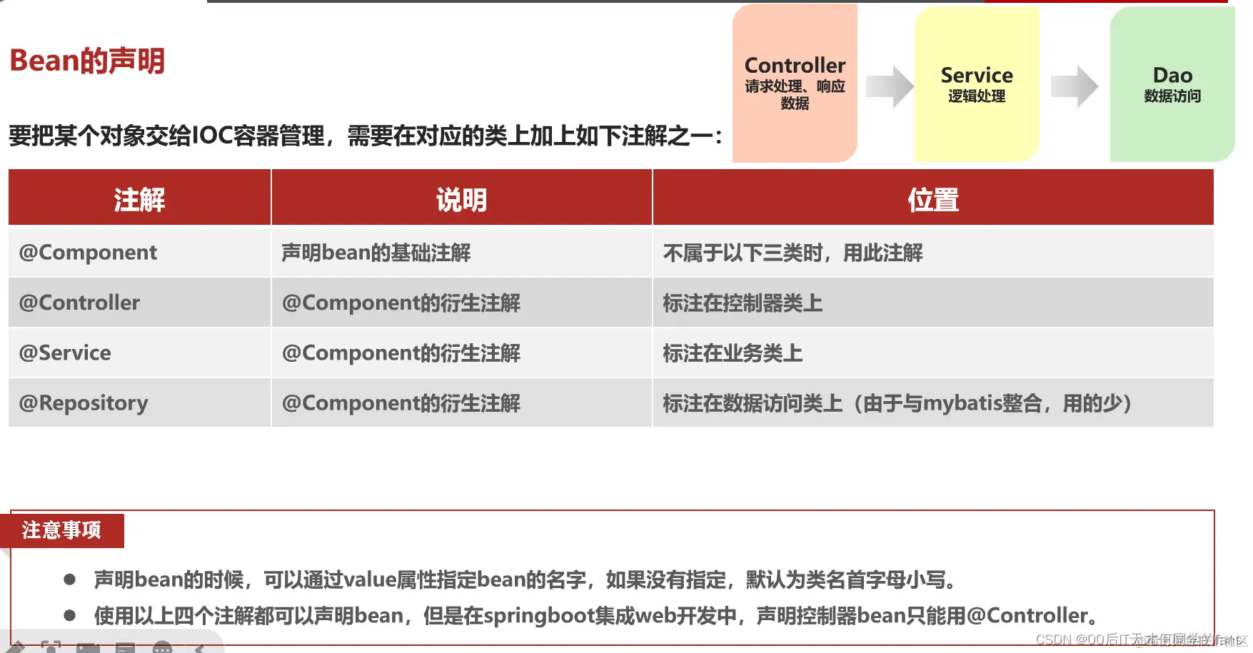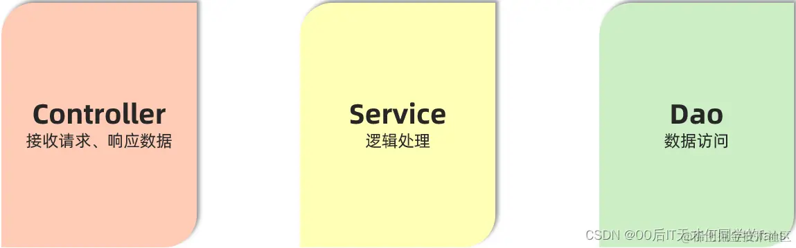 - 这三个注解分别用来标识Controller层的Bean对象、Service层的Bean对象、Dao层的Bean对象。