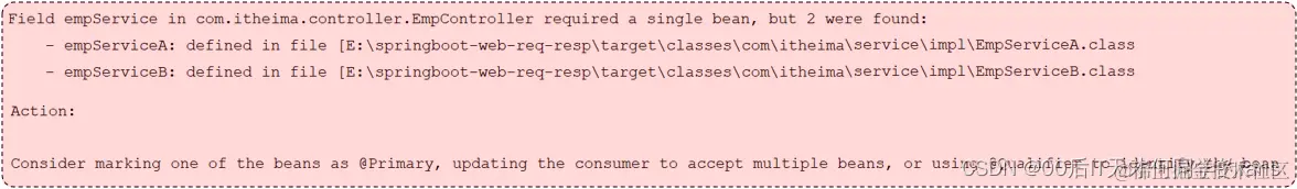 现在EmpService的Bean对象就有了两个,一个是EmpServiceA,一个是EmpServiceB,现在程序 运行的时候到底注入的是A还是B呢?