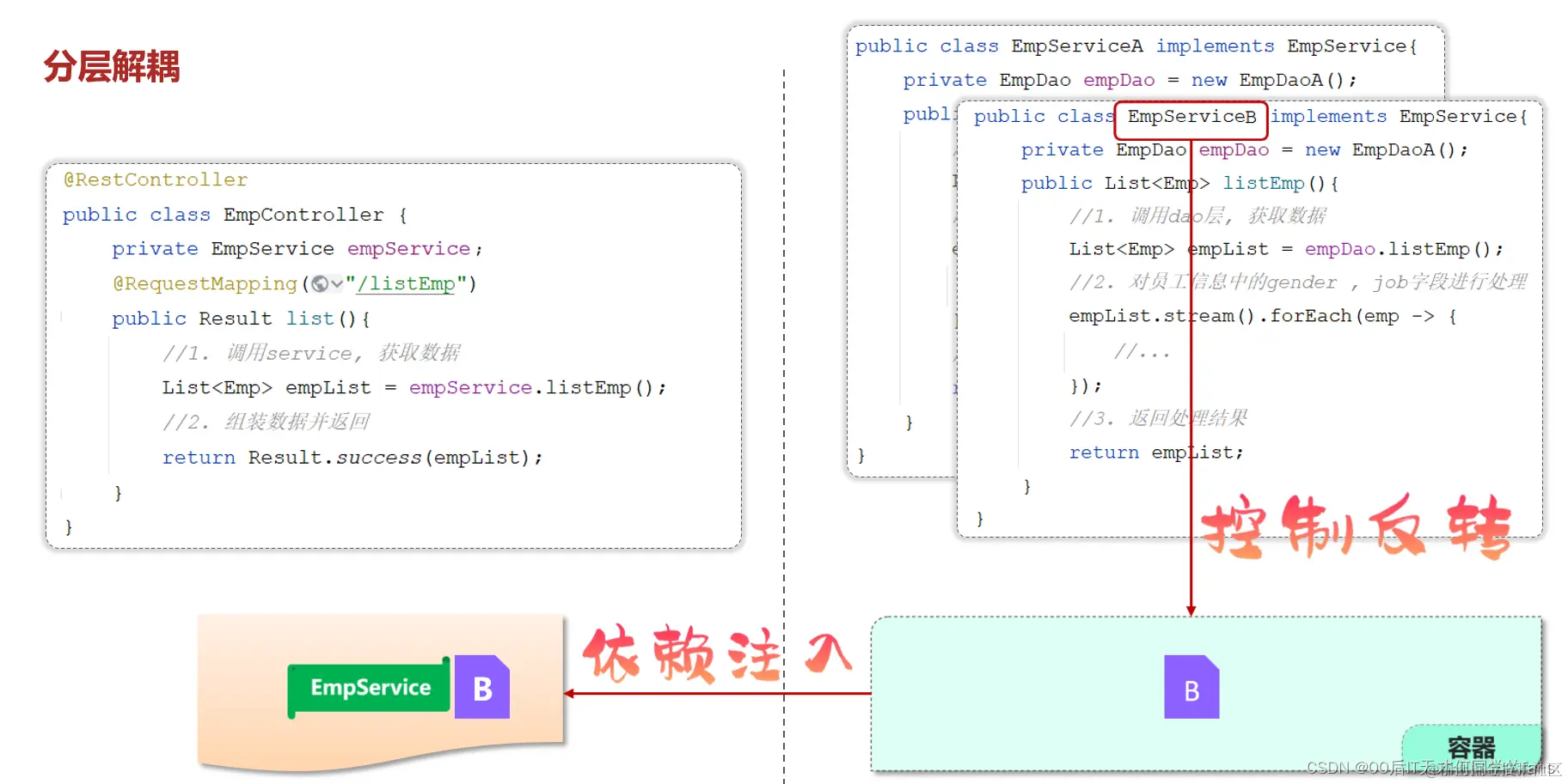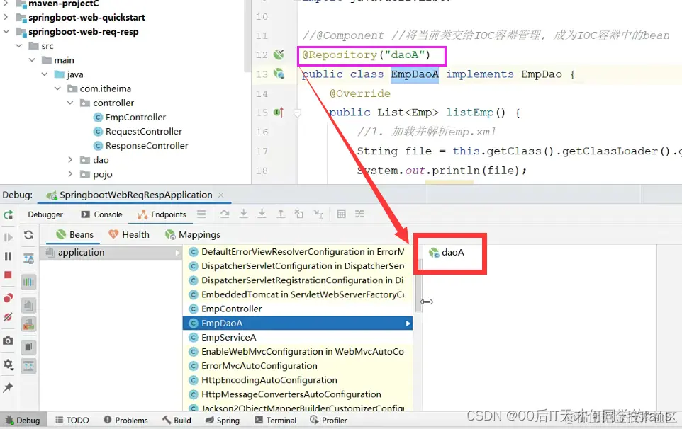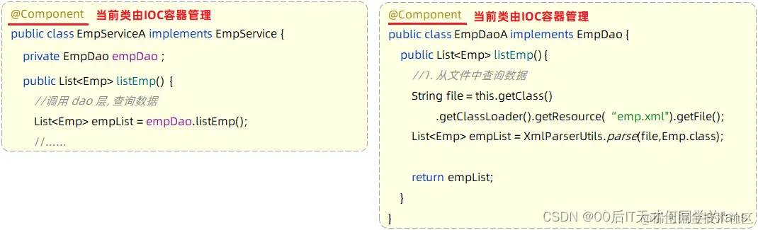 入门程序举例:在EmpController运行的时候,就要到IOC容器当中去查找EmpService这个类型的对象,而我们的IOC容器中刚好有一个EmpService这个类型的对象,所以就找到了这个类型的对象完成注入操作。
