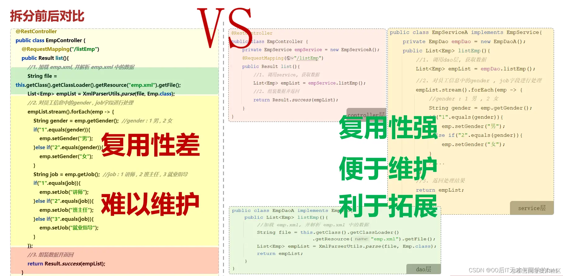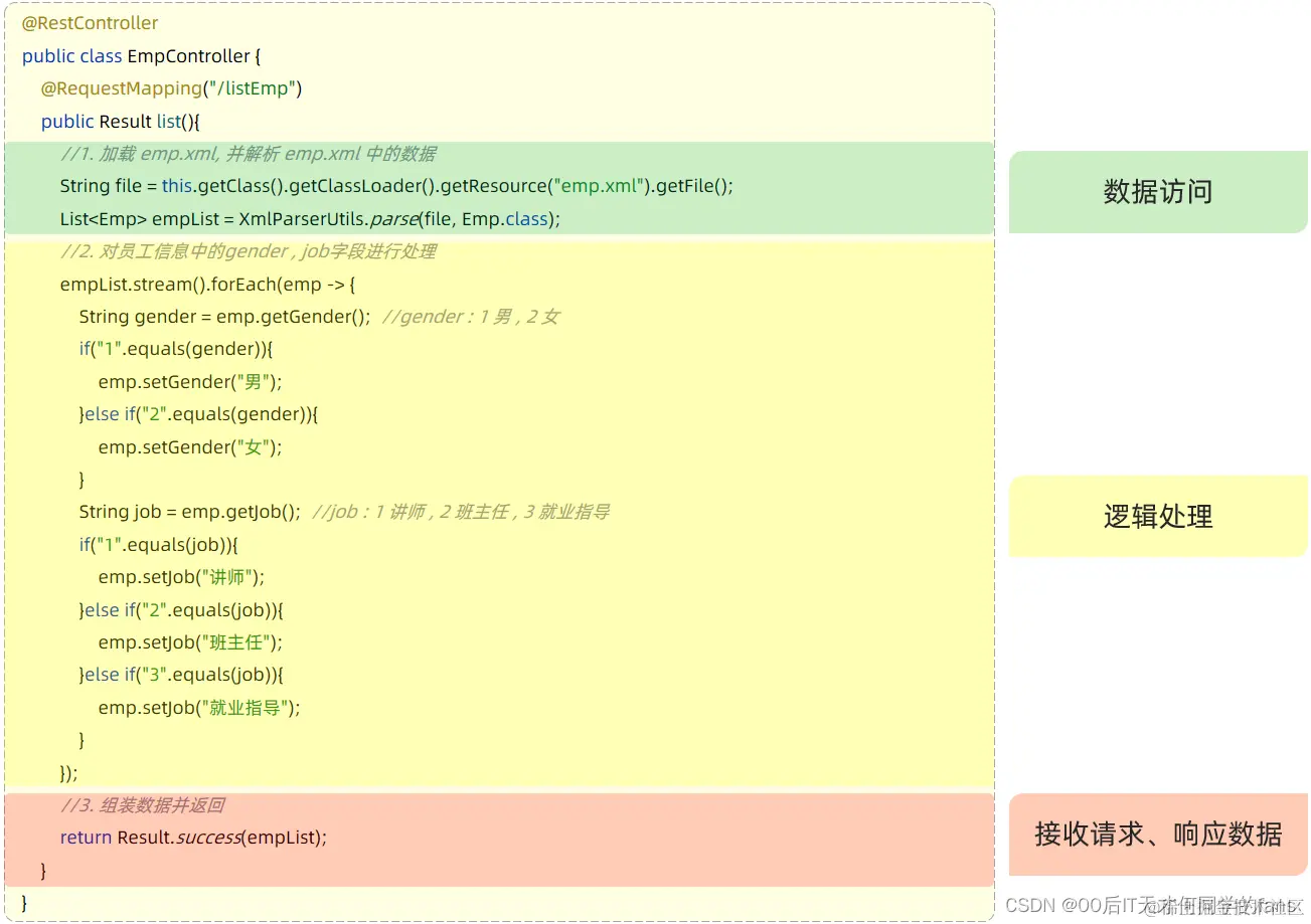 - 前端: 只需要按照统一格式的返回结果进行解析(仅一种解析方案),就可以拿到数据。
