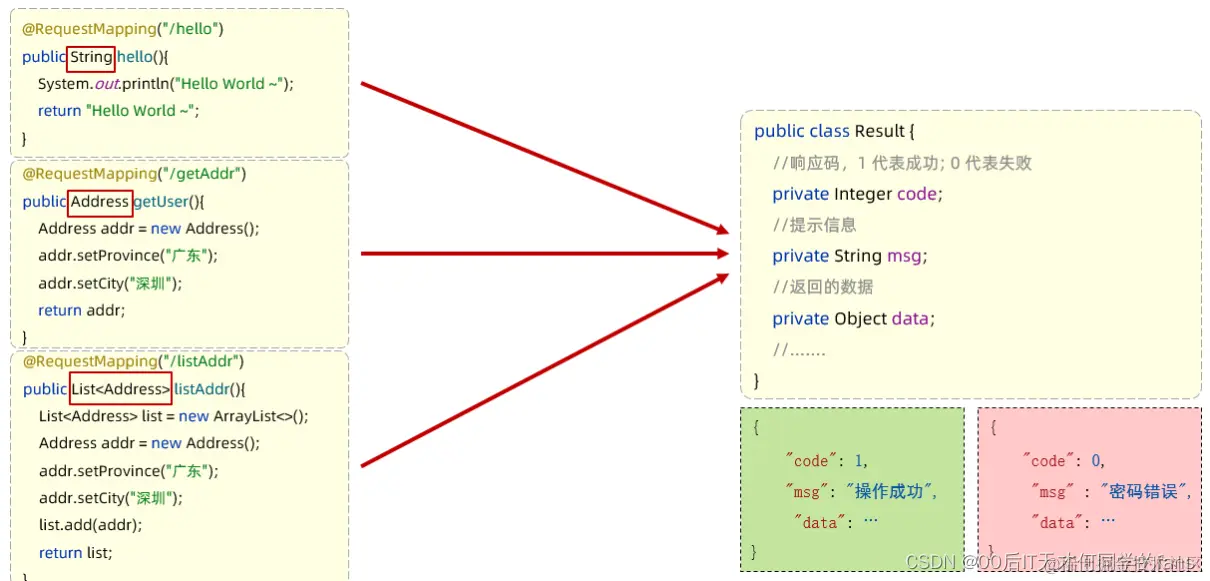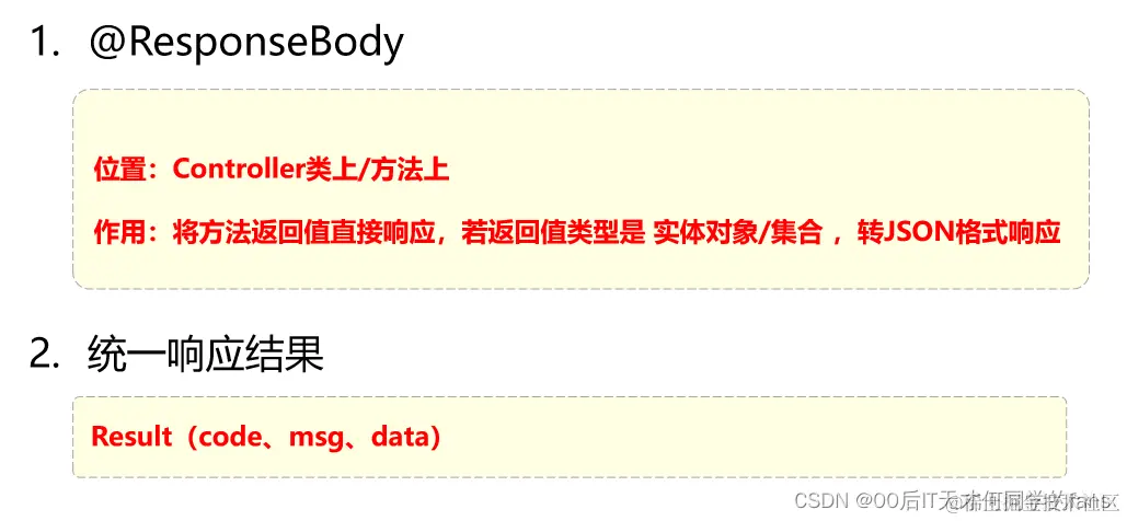 - 既然是统一的响应结果,也就意味着所有的Controller方法,都要返回一个Result对象,最终前端拿到的就只是这一种格式的数据,它只需要根据这一种格式来进行解析就可以了(仅一种解析方案)。