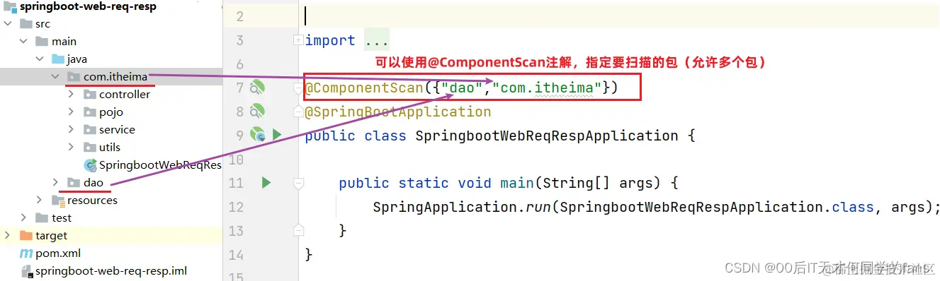 @ComponentScan注解虽然没有显式配置,但是实际上已经包含在了启动类 / 引导类声明注解 @SpringBootApplication 中,默认扫描的范围是SpringBoot启动类所在包及其子包: