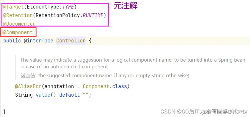 - 我们可以看到这个注解上面声明了五个注解,前三个注解叫做元注解,元注解指的是修饰注解的注解,所以 @RestController当中主要封装了两个注解,一个是@Controller,另一个是@ResponseBody。