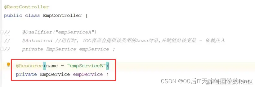 3. 使用@Resource注解:此时就不要使用@Autowired这个注解来注入了,使用另外一种注入形 式:@Resource注解来指定我要注入的是哪个Bean, @Resource注解是按照bean的名称进 行注入,通过name属性指定要注入的bean的名称。